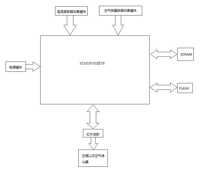 本设计以stm32微控制作为核心处理器,利用pmv、热舒适方程设计最适温度算法,同时利用多传感器对室内的家居环境包括空气质量等指标进行实时的监测,然后控制空气净化器的开启并将房间内的环境监测数据利用gprs技术发送至用户移动端。本设计选用stm32f103zet6作为核心处理器,选用高性能的tc35i作为gsm模块完成远程移动通信,该模块通过接口连接器和天线连接器分别连接sim卡读卡器和天线即可实现无线通信模块与控制器的硬件连接。在环境数据监测方面,选用dht11温湿度传感器来获取室内环境的实时湿度,选用ds18b20数字温度传感器完成温度数据的采集,为最适温度算法提供输入量。控制器对空调以及空气净化器的控制都是基于红外传输技术实现。具体硬件设计电路包括:电源模块,时钟模块,红外发射模块,温湿度采集模块,空气质量监测模块,以及gsm模块。首先进行对室内的环境数据进行采集、还原、存储电路和dsp最小系统的设计,然后基于pmv及热舒适方程完成最适温度计算设定,并进行仿真论证,编写单片机程序,实现整个家电的智能化以及环境监测过程。本设计的实现原理框图如图1所示: