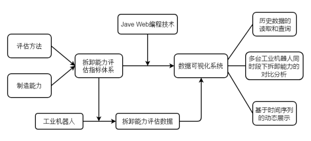 本文旨在通过归纳分析可持续制造环境下与工业机器人拆卸能力相关的指标,从而建立全面的评估指标体系,进而通过合适的方法对工业机器人进行拆卸能力评估。在此基础上,通过设计一个web数据可视化系统,将工业机器人拆卸能力评估数据进行基于时间序列的动态展示,同时,系统应要满足拆卸能力历史数据的读取和查询,以及多台工业机器人同时段下拆卸能力的对比分析。