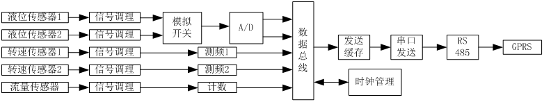 整个系统结构框图由电压电流信号调理模块、脉冲信号调理模块、模拟开关模块、ad转换模块、rs485串口模块、gprs数据传输模块和fpga中心数据处理模块组成。