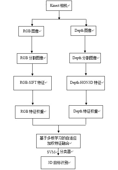 本研究基于python-opencv平台,拟结合rgb图像和depth图像各自的优势,提取目标物体的rgb特征和depth特征,并根据两种特征的类内、类间相似性均值和方差,为特征自适应分配不同的权重,最后利用多核学习(mkl)中的方法对特征进行加权融合,并结合svm分类器,实现3d目标识别,并在rgb-d数据集上进行实验,验证目标识别方法的有效性。其中在特征提取时需要选择具有仿射不变性的特征作为rgb图像和深度图像的特征描述子,利用类内、类间相似性均值和相似性方差的比值作为衡量特征判别能力大小的权重,从而将对两种特征的融合转换为对其相应的特征核的融合,从而形成对3d物体的识别方法。