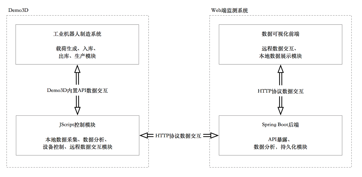 - 使用Spring Boot进行后端开发,暴露出Demo3D将要请求的API;对Demo3D发送的数据进行过滤、分析和持久化。提供前端控制页面将要请求的API,将持久化的数据格式化以JSON格式发送到前端,便于前端对数据进行可视化。