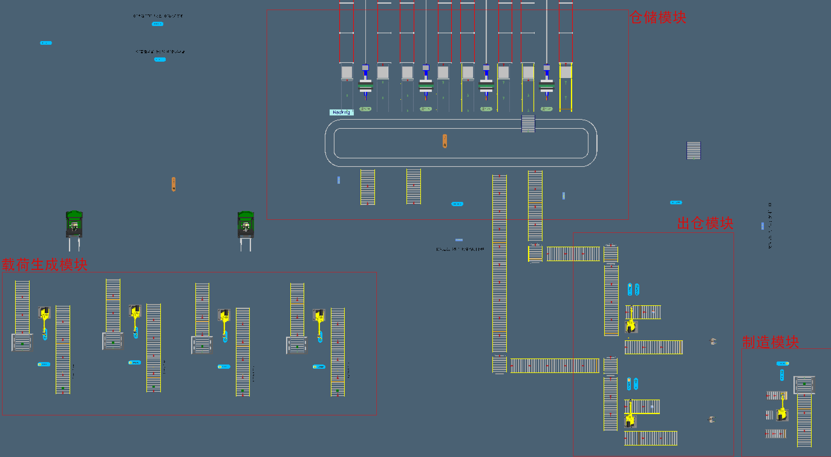 在构建一个简单的工业机器人制造车间时,为了更加贴近真实的制造情况,在此将车间分为四个模块,分别为载荷生成模块、入库模块、出库模块和制造模块[11]。这四个模块包含了一系列的组件,如传送带、工业机器人、叉车、AGV车,ASRS自动化立体仓库等。各模块通过Demo3D中的传输机制连接在一起,让模型能够有条不紊的运行。最后还通过JScript实现了对整个模型的监控。本章将从车间的设计以及JScript对模型的控制这两个方面分别进行详细的说明。