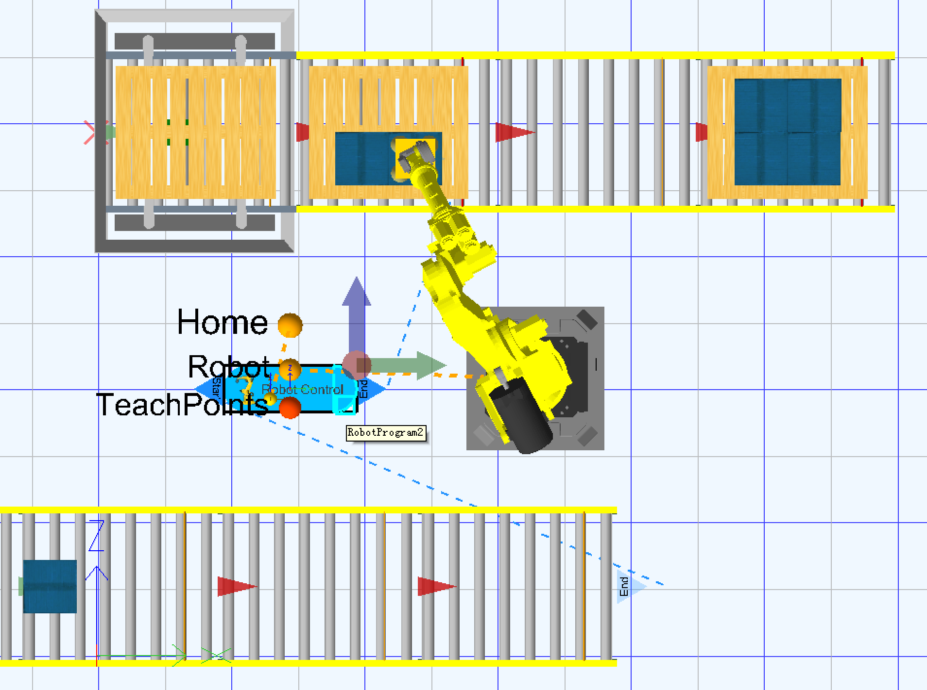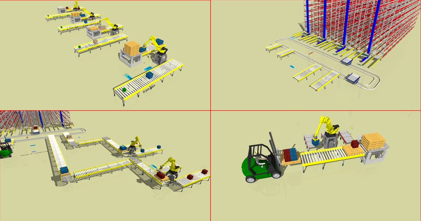 - 使用Demo3D自带的物流组件建立一个工业机器人虚拟制造车间,包括一个货物生成模块、一个货物存储模块、一个出库模块以及一个制造模块。
