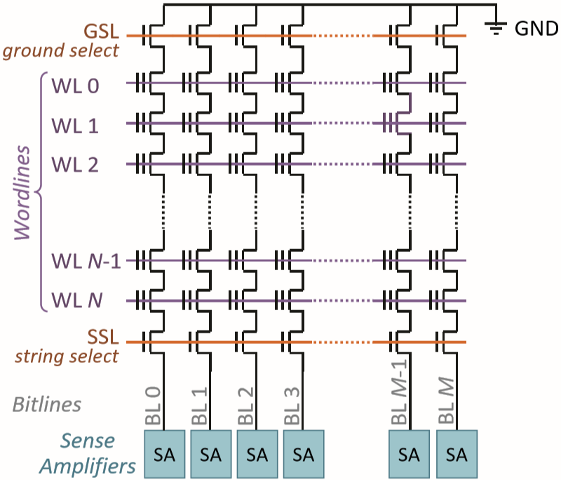 图2.2是固态盘中一个闪存块的结构,其中每根横向的字线(WL)构成一个闪存页,在同一个闪存块中的页共用同一个衬底,纵向的BL为字线,横向第一行与最后一行(GSL与SSL)为选择栅[19]。写操作是在控制栅极加正电压,使电子通过绝缘层进入存储层,擦除操作则是在衬底加正电压,将电子从存储层吸出。因此,NAND闪存最主要的特性在于读写操作以闪存页执行,而擦除操作是以闪存块为单位执行。除此之外,闪存还有一些其他特性,比如:每擦除一次闪存块就会对闪存块造成磨损,因此闪存块是具有耐久度的;读操作会导致存储单元中的电荷数目变化,从而产生比特翻转的错误;由于电荷的流失,存储在闪存中的数据会丢失,且温度越高电荷流失速度越快,数据保存时间越短;更新写入的数据只能放在空闲的闪存页,成为新的有效页,而该数据所在的原来的闪存页被置为无效,若要对一个已经写入数据的闪存页再次写入,必须先执行擦除操做。
