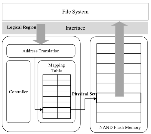 NAND闪存被广泛使用,它拥有高密度、轻重量、防电流冲击、非易失和低能耗等优点。尽管NAND闪存有诸多优点,因为结构特性,它仍然存在一些缺陷/特性,如上一节所论述。因此各种各样的闪存转换层(FTL)被提出以处理这些特性。闪存转换层是固态盘固件的核心组成,主要由三个功能构成:地址映射、垃圾回收和磨损均衡。