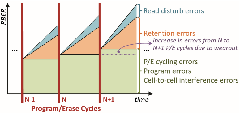 RAID机制产生的晶圆级奇偶校验信息更新即为上述的全局FTL任务的一种。闪存存在可靠性问题,包括比特错误(由多种噪声导致,如编程/擦除次数和数据保留损失)和存储元器件故障(如字线和晶圆)[5,29]。尽管固态盘内使用了纠错编码以降低比特错误率,但它无法解决元器件故障的问题。因此,RAID机制在保护固态盘免受纠错编码无法纠正的比特错误和元器件故障的影响中起着不可获缺的作用。广泛应用的RAID机制主要是RAID-5和RAID-4[14,15,16,17,18,19,20,21,22,23]。