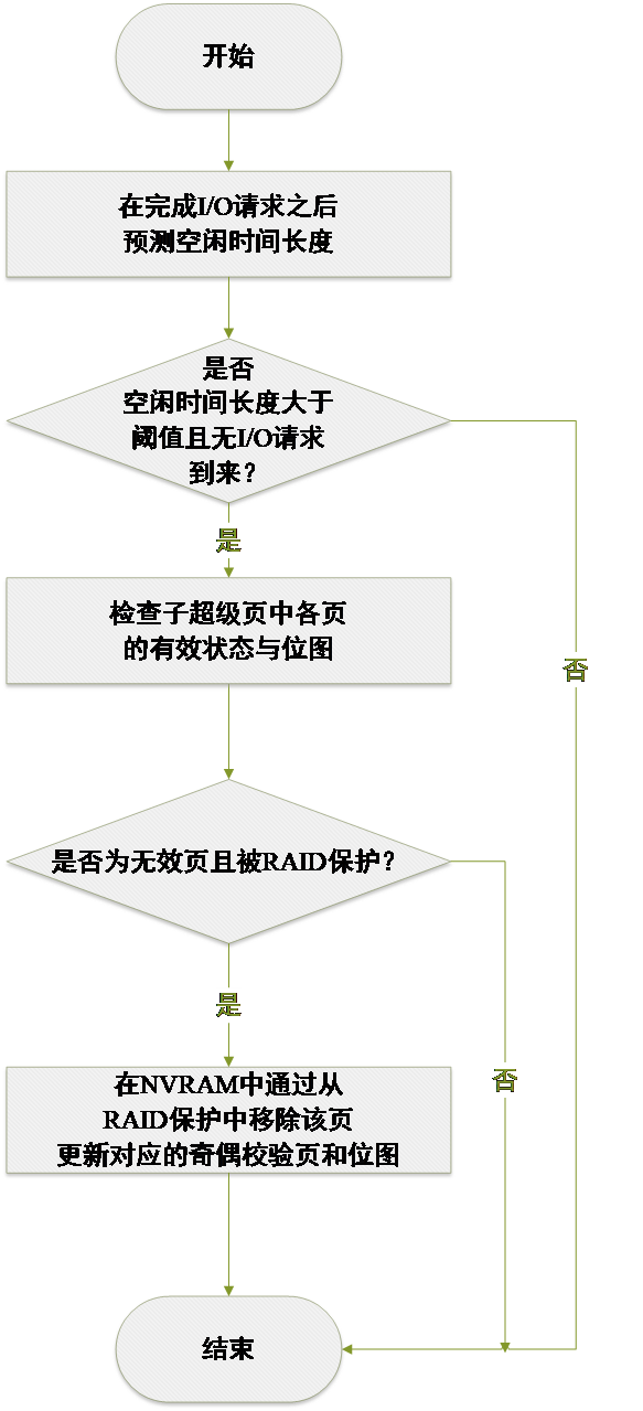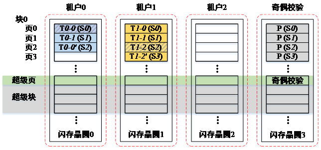 一种容易想到的解决办法是将基于超级页的RAID-4中作为奇偶校验盘的NAND闪存介质用NVRAM代替以消除性能瓶颈问题。我们称这种解决方案为Naive RAID-4机制。然而,在这种方案中,奇偶校验信息的更新仍会干扰到租户的I/O性能。因为闪存自身的写入特性,新的数据只能写入空闲的闪存页而不能在原处更新写入,只有以闪存块为单位擦除数据后才能重新写入新的数据,因此会产生无效页,垃圾回收操作是当固态盘内空闲空间不够时执行擦除操作以回收无效页占用的空间。在Naive RAID-4机制中,奇偶校验信息的更新是由租户写入数据或固态盘执行垃圾回收操作引起的。租户写入引起的奇偶校验信息更新可以只通过奇偶校验盘的数据存取完成,从而不会干扰到用户的性能。而由垃圾回收引起的奇偶校验更新需要额外对数据盘中的无效页进行读操作才能计算出对应条带的新的奇偶校验信息并更新写入奇偶校验盘,所以会导致租户I/O性能的下降。并且,随着租户的闪存块中无效页比例增加,性能下降的程度会越大。