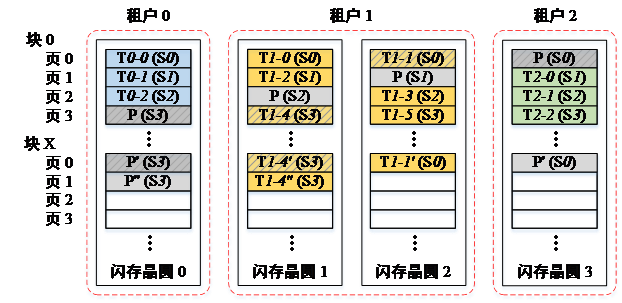 基于软件和硬件的固态盘虚拟化技术已被学术和产业研究人员提出,以提供多租户间的性能隔离。闪存晶圆是固态盘中能独立执行闪存操作的基本单元[9]。软件虚拟化技术将指定的闪存块分配给各租户,而一个闪存晶圆被多个租户共享[8,9,10,11,12]。尽管这种设计能通过将数据组成跨闪存晶圆的条带来提高I/O吞吐量和存储空间利用率,但每个闪存晶圆中存在严重的租户间I/O干扰。为提升性能隔离,硬件虚拟化技术将固定数量的闪存晶圆分配给指定的租户[3,5,6,13]。硬件虚拟化使来自不同租户的I/O请求和局部FTL任务在独立的环境中得到处理,然而固态盘的全局FTL任务仍会干扰租户的I/O性能。