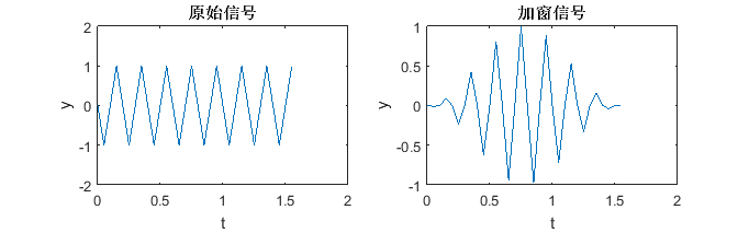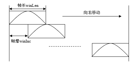 接下来的分帧和加窗处理实际上是合并在一起的操作。根据上文所述,语音信号具有短时平稳性,这个短时一般指10~30ms,在这样短的时间内通常可以认为语音信号是平稳的。这样就可以把语音信号划分成一段一段的语音段来处理,语音段的长度通常在10~30ms之间,把这样划分语音段的处理称为分帧,每秒的帧数约为33~100帧。加窗则是对每一个帧的操作,即每一帧与一个窗函数相乘,以提高帧左右两侧的连续性,简单的加窗操作如图2.1所示: