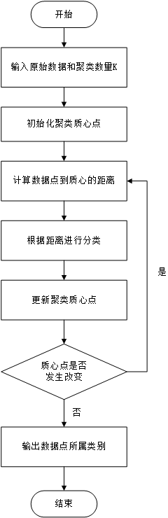 首先,我们要确定聚类的数量,并初始化同等数量的聚类质心点,初始化质心点的过程可以随机,但更好的方式是在输入的数据中合理地选择几个数据点作为质心点;其次,计算每个数据点到质心点的距离,并根据距离的远近进行分类,数据点离哪个质心点近,它就被分到该聚类;接着,更新聚类质心点,即新的质心点应当满足聚类里每个点到它的欧氏距离平方和最小这个条件;最后,判断质心点是否发生改变,若是则重复二三步骤,不断迭代更新聚类质心点,直到聚类质心点相对稳定,若未发生改变则直接输出数据点所属类别序列。