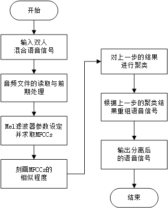 据前文所述,语音分离可细分为三类,本文研究的内容属于“多说话人分离”。与其他两类分离不同,多说话人分离主要解决的问题是“某个时刻是谁说的话”。根据有无监督分离,又可以分为有监督分离、半监督分离和无监督分离;根据与文本有无关联,又可以分为与文本无关、与文本有关和文本指定型。本文所研究的基于聚类的双人混合语音的分离,因其聚类分析的无监督性,属于与文本无关的无监督分离。这样的“多说话人分离”常用的分离方法是,根据噪声与语音之间的差异,在时间轴上划分出多个语音帧块,用聚类的方法对这些语音帧块进行处理,将不同说话人的语音帧块分别标记,最后将属于同一个说话人的语音帧块重新组合在一起。本文将大致按照上述分离方法进行研究,在实现方式或方法上会有所差异。