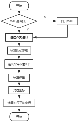 其中(x,y)就是待定地点的坐标,(xi,yi)是取出的K个数据的坐标,这个Kgt;2,因为不能让已知指纹信息过于单一,但是也不能过大,否则太远的也就没了意义,要根据 实际情况选择最佳的K。