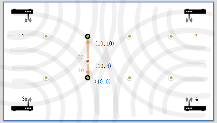(1)K最近邻法:这种方法是从最近邻算法中演变出来的。在最近邻算法中我们对于一个未知地点,直接搜索其WIFI的RSSI,然后对比每个指纹对应地点距离,距离最小的地点就是这个未知地点的,但是这样实际上在现实中是不准确的,所以进一步改进成K最近邻算法。算法的思想是这样的:采取未知地点的RSSI指纹信息,然后计算这个指纹与所有指纹的距离,从小到大排列,选出前K个数据出来,然后将他们的坐标取平均,就是待定位置的坐标地点,如下: