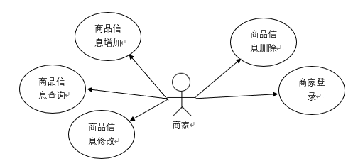 对于商家,发布与删除商品信息是维持网络商铺运行的最基本需求,而为了便于商品信息管理,则应该提供商品信息的查询功能以及修改功能。商家模块用例图如图2.3所示。