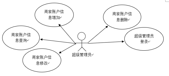 对于超级管理员,为了管理商家账户信息,对商家用户信息的增加功能与删除功能是必不可少的,而为了方便管理,提高效率,则应该加入查询功能以及删除功能。超级管理员模块用例图如图2.4所示。