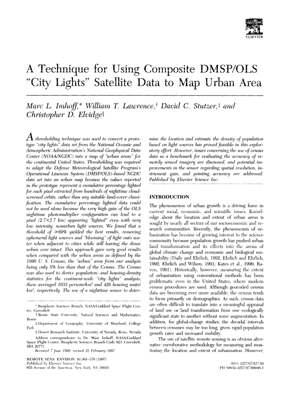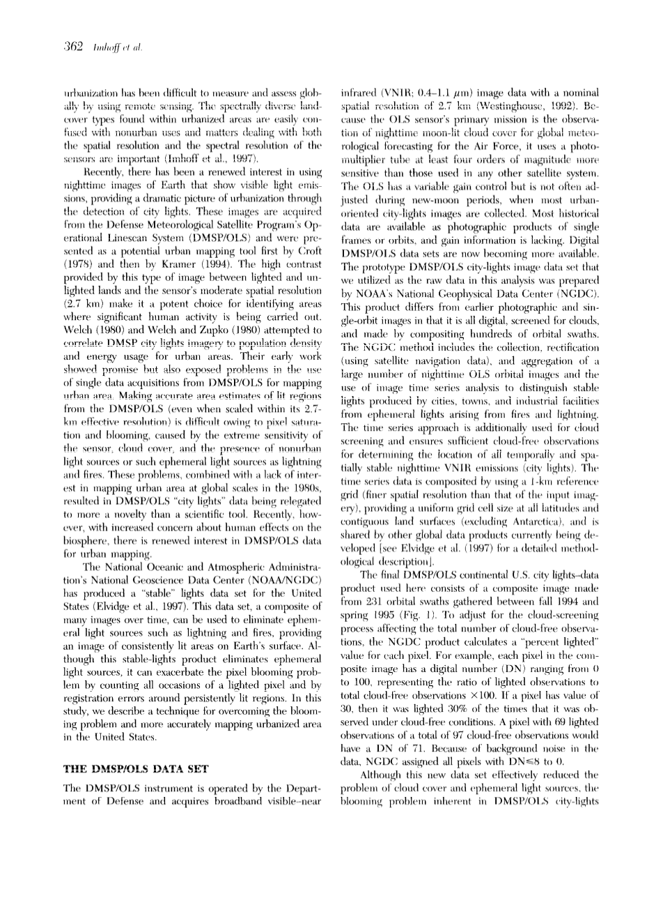 研究采用阈值化技术将美国国家海洋和大气管理局国家地球物理数据中心(NOAA/NGDC)的原始“夜光遥感”数据集转换为美洲大陆的“城市建成区域”地图。由于原始数据的像元DN值代表从数百个夜间云屏蔽通道提取的像元的累积光照百分比,而不是任何合适的土地覆盖分类,所以需要将基于DMSP/OLS的国防气象卫星3号项目的NGDC数据集通过阈值化方法提取城市建成区域。夜光遥感图像的累积百分比数据不能直接使用,是由于OLS夜间光电倍增器配置的高增益器会导致一个像元(2.7X2.7公里)即使在非常低的光照强度、非城市光源照射的情况下也会有较高的DN值。研究发现,89%的阈值效果最好,能够在剔除短暂的光源噪声和海岸线附近的像元晕染误差的同时保持城市核心区域的完整。通与1990年美国人口普查的城市建成区域数据进行比较,这种方法取得了非常精确的结果。通过这种阈值化方法提取的城市建成区域面积只比人口普查统计的城市建成区面积少5%;人口普查数据也被用来评价由“城市灯光”分析得出人口密度(1033人/km2)和住房密度(426户/km2)统计数据。利用夜光传感器根据光源确定目标点和估计人口密度的方法在研究工作中证明是可行的。同时还讨论了使用普查数据作为评价遥感图像精度的基准的问题和如何改进传感器在空间分辨率、仪器增益和指向精度方面的问题。