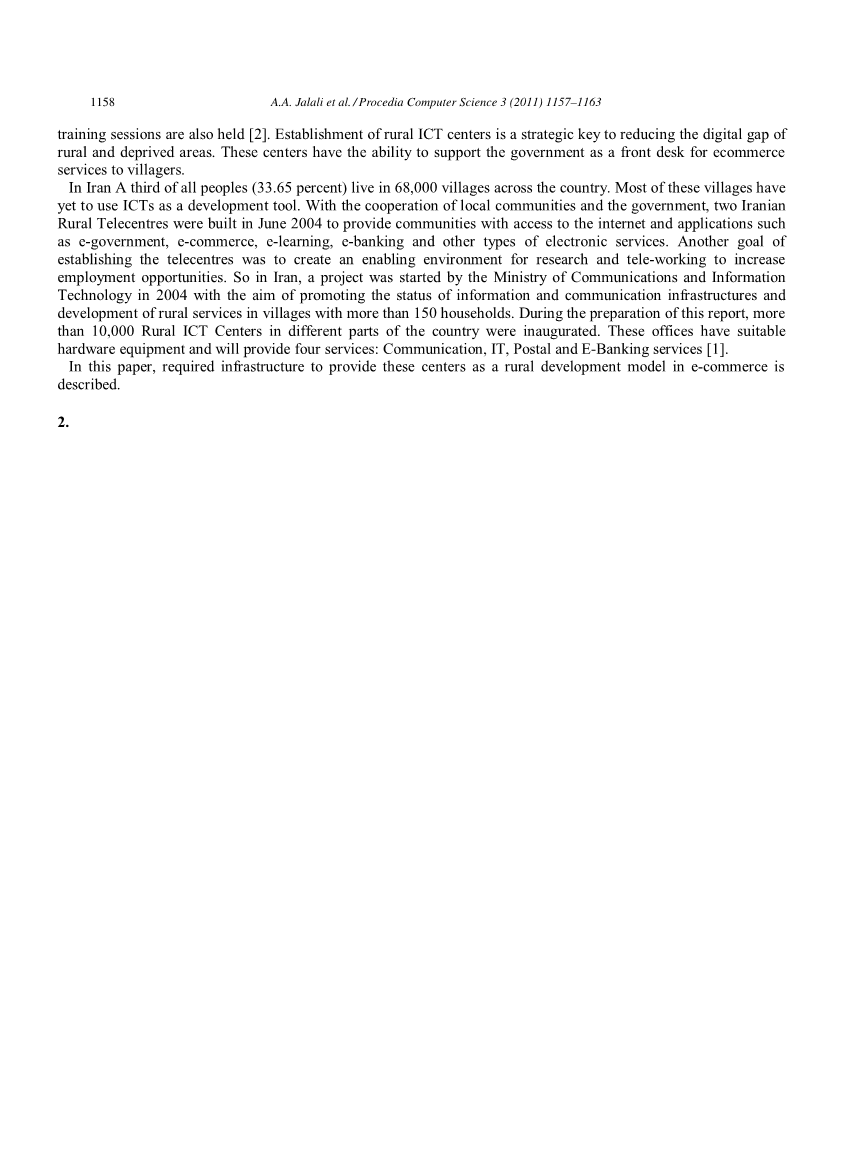 在伊朗,三分之一的人口(33.65%)分布在全国各地的68000个村庄中。大多数村庄没有使用过像信息通信技术这种先进的开发工具。在与当地社区和政府的合作下,2004年6月建立了两个伊朗农村电信中心,为农村居民提供诸如电子政务、电子商务、电子学习、电子银行和其他类型的电子服务。建立电信中心的另一个目标是为研究和远程工作创造一个有利环境,增加就业机会。因此,在伊朗,交通信息技术部于2004年启动了一个项目,目的是促进150多项农村信息通信基础设施建设和乡村服务发展。在编写本报告期间,全国不同地区的1万多个农村信息通信技术中心成立。这些办事处有合适的硬件设备,并将提供四种服务:通讯、IT、邮政和电子银行服务[1]。在本文中,描述了将这些中心作为农村电子商务发展模式所需的基础设施。