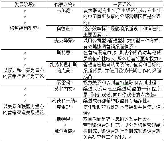 西方学者关于营销渠道的研究忽视企业环境的影响,而是更多的把组织和渠道成员行为作为过多重视的对象,所以研究的重点常常出现在渠道冲突,渠道竞争和合作关系等领域。如斯培克曼曾就如何选择渠道成员做出过深入研究,并提出“管理者要培养与自身价值观和目标相契合的渠道成员”。学者克雷玛认为信任是渠道资本,渠道成员间可以通过信任扭转不良的结果。在渠道成员体系研究上,学者葛雷玛对谈判行为和绩效进行了深入研究,他提出“谈判者特征和成员间的权利关系是影响谈判过程和结果的主要因素”。然而,西方的研究在对社会文化,政治政策,经济条件,社会价值观等因素影响方面的研究涉猎较少,没有关注到它们在市场中的重要作用。西方学者关于营销渠道管理的研究的具体阶段和理论成果可以如表1.1所示。