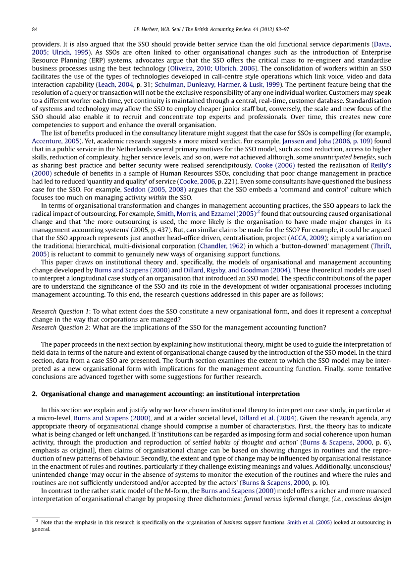 根据SSO模型的引入导致的组织变更的性质和程度的现场数据。在第三个部分,来自案例SSO的数据被呈现。第四部分考察了SSO模型在多大程度上可以被解释为一种新的组织形式,对管理会计职能有影响。最后,一些试探性的结论与一些进一步研究的建议一起提出。