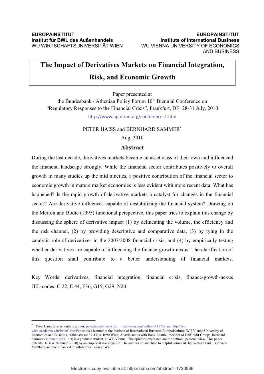 衍生品市场对金融一体化、风险和经济增长的影响外文翻译资料