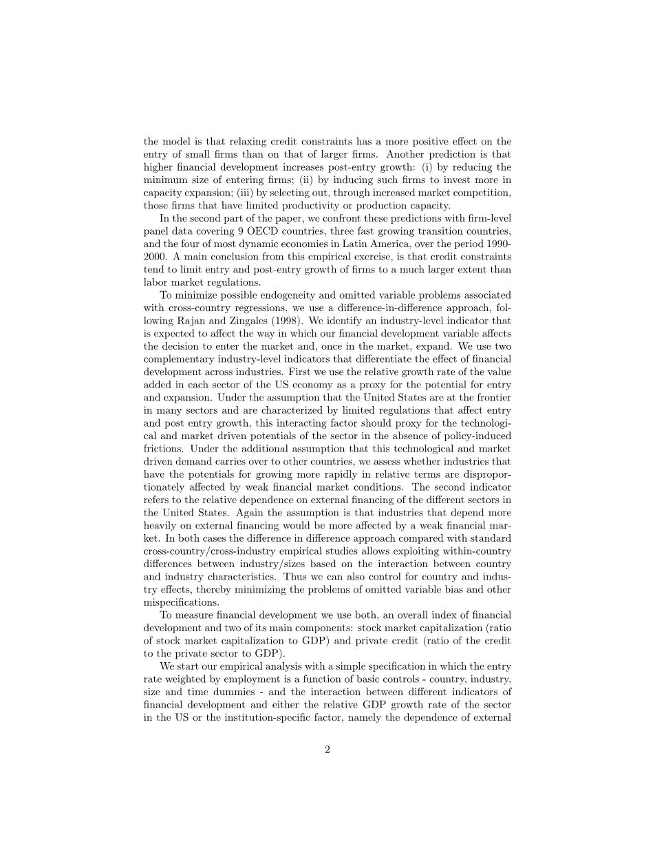 在本文的第二部分,我们将这些预测与1990年至2000年期间覆盖9个经合组织国家,三个快速增长的转型国家和拉丁美洲最具活力的四个经济体的企业级小组数据进行对比。这一实证研究得出的一个主要结论是,信贷约束倾向于将公司的进入和进入后增长限制在比劳动力市场法规更大的范围内。