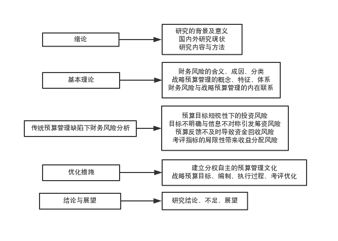 导论部分对本文的背景和意义进行了说明,并对国内外财务风险防范下的战略预算管理的研究情况进行总结分析,指出了本文的研究内容和研究方法。第二部分就财务风险与战略预算管理的理论知识进行介绍,并指出战略预算在财务风险防范中的作用;第三部分为分析了传统预算管理的不足及其潜藏的财务风险;第四部分根据现状分析提出了战略预算管理应如何对环境、目标、编制程序与方法、执行过程以及绩效考评进行优化,以此来防范财务风险;最后一章总结了文章的内容,指出研究中的不足,并对未来的研究方向进行了展望。