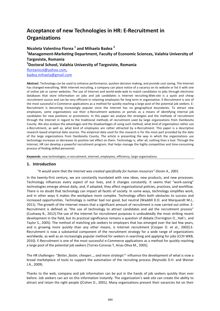 摘要:技术可用于提高性能,加快决策制定,并节省成本。互联网改变了一切。通过互联网招聘,公司可以在其网站上发布空缺通知或将其列在在线工作或职业网站之一。使用互联网和万维网通过电子数据库将候选人与工作相匹配,这些数据存储工作和求职者的信息是互联网招聘。网站是一个快速和廉价的招聘来源,可以非常有效地长期留住员工组织中的术语。电子招聘是最成功的电子商务应用程序之一,作为快速覆盖大量潜在求职者的方法。由于互联网没有地域界限,电子招聘正变得越来越受欢迎。为了吸引新员工,一些组织使用他们的电子招聘网站或门户网站作为识别新职位或晋升的内部求职者的手段。在本文中,我们通过互联网分析了Dambovita的大型组织使用的传统招聘方法的招聘策略和方法。我们还分析了使用这种方法的优点和缺点,什么样的组织比较使用电子招聘,以及什么样的员工更喜欢电子招聘。本文是一个基于描述性研究的经验数据来源。用于研究的经验数据大部分来自Dambovita的大型组织的数据。本文介绍了组织使用技术的方式增加或减少其对它们的积极净效应。毕竟,技术不过是一种工具。通过互联网,人力资源部门可以开发一个强大的招聘计划,帮助管理高度竞争和耗时的寻找技术人员的过程。