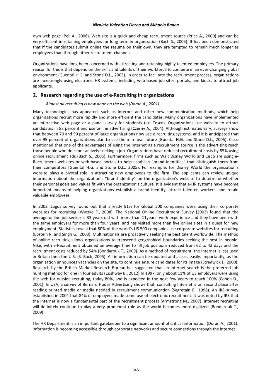 2002年,iLogos调查发现全球500强公司已有91%的公司网站用于招聘(Wuttke F.,2008)。全国在线招聘调查(2003年)发现,平均在线求职者年龄为33岁,有超过11年的工作经验,他们与同一雇主在一起超过四年,并访问过五个以上的在线网站。寻求新的就业机会。统计数据显示,全球80%的美国500强公司使用企业网站进行招聘(Epstein R.和Singh G.,2003)。跨国公司正积极寻求全球最优秀的人才。在线招聘的方法允许组织超越寻求最佳人选的地理边界。耐克公司通过电子招聘获得的平均工作时间从62天减少到42天,招聘成本减少了54%(Bondarouk T.,2009)。作为一种招募方式,互联网在英国的使用较少,而美国则较少(S. Bach,2005)。所有信息都可以轻松更新和访问。重要的是,当该组织宣布该网站的空缺时,继续确保其形象的候选人(Stredwick J.,2000)。英国市场研究局的研究表明,互联网搜索是四分之一成年人中首选的求职方法(Cushway B.,2012)。1997年,只有约11%的美国雇主使用网络进行外部招聘,今天80%,预计在未来几年达到100%(Cohen D.,2001)。在美国,Bernard Hodes Advertising的一项调查显示,在阅读招聘传播所需的印刷媒体或媒体后,咨询互联网位居第二(Segretain E.,1998)。 2004年建立的国税局调查显示,84%的雇主使用电子招聘。美国国税局指出,互联网现在是招聘过程的基本组成部分(Armstrong M.,2007)。随着世界变得更加数字化,互联网招聘肯定会继续发挥非常突出的作用(Bondarouk T.,2009)。
