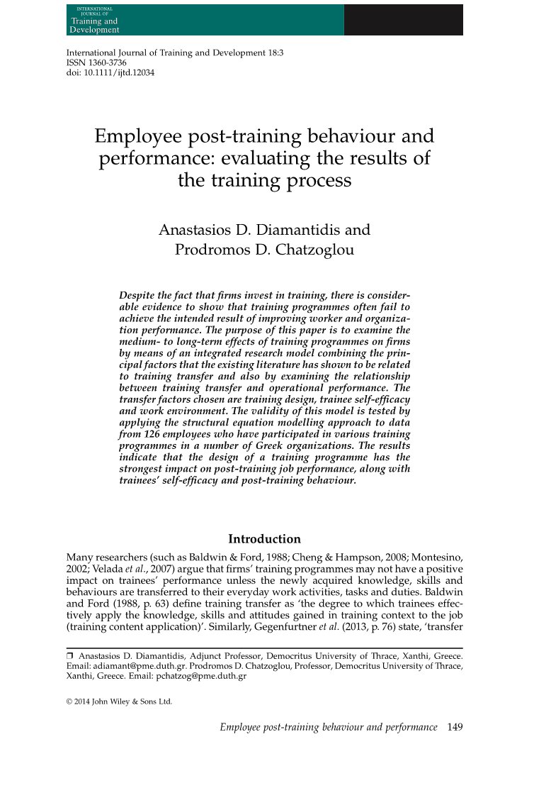 本研究考察了员工参与培训计划的中长期影响。换句话说,它检查员工参与培训计划是否符合推动公司执行培训计划的决定的目标。结果表明,培训过程的设计和组织方式是为参与者学员及其企业取得积极成果的基础。转介设计对培训结果的影响,由提出的模式所包含的其他一些因素(主要是自我效能,行为和培训转化)加强。转化设计对所有这些因素具有很强的直接和/或间接影响,表明这些因素与转化设计之间存在高度依赖关系。