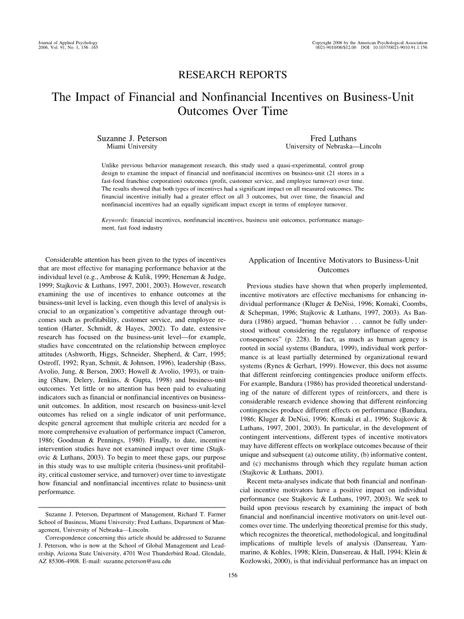 与以前的行为管理研究不同,本研究使用准实验性控制组设计来研究财务和非财务激励随着时间推移对业务部门(快餐连锁企业中的21家商店)成果(利润,客户服务和员工)的影响。结果表明,这两种激励措施均对所有衡量的结果产生重大影响。最初,财务激励对所有三个结果都产生了较大的影响,但是随着时间的流逝,财务激励和非财务激励对员工的流动性都产生了同等重要的影响。