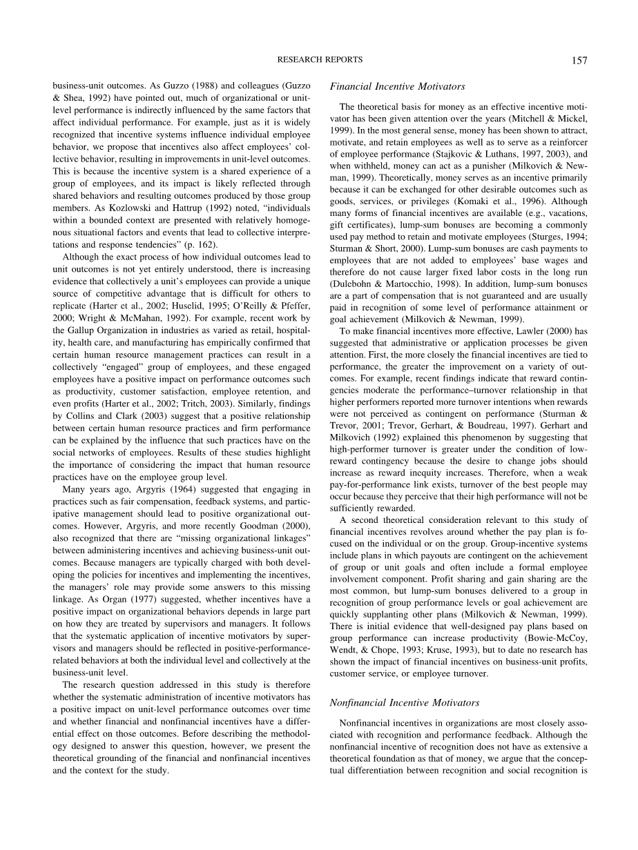 最近的Meta-Analysis表明,财务和非财务激励因素都对个人绩效产生积极影响(见Stajkovic和Luthans,1997,2003)。我们试图通过研究财务和非财务激励因素随时间推移对单位级别结果的影响来建立在先前的研究基础上。这项研究的基础理论前提是认识到理论上的,方法上的,和多层次分析的纵向含义(Dansereau,Yammarino和Kohles,1998年;Klein,Dansereau和Hall,1994年; Klein和Kozlowski,2000年),即个人绩效会对业务部门的业绩产生影响。正如Guzzo(1988)和同事(Guzzo和Shea,1992)指出,许多组织或单位级别的绩效都受到影响个人绩效的相同因素的间接影响。例如,正如众所周知的那样,激励制度会影响员工的个人行为,我们建议激励措施也会影响员工的集体行为,从而改善单位级别的绩效。这是因为激励机制是一组员工的共享经验,其影响很可能通过这些员工共享的行为和产生的结果来反映。正如Kozlowski和Hattrup(1992)所指出的,“在有限的语境中,个人被呈现出相对同质的情境因素和事件,从而导致集体的解释和反应倾向”(第162页)。