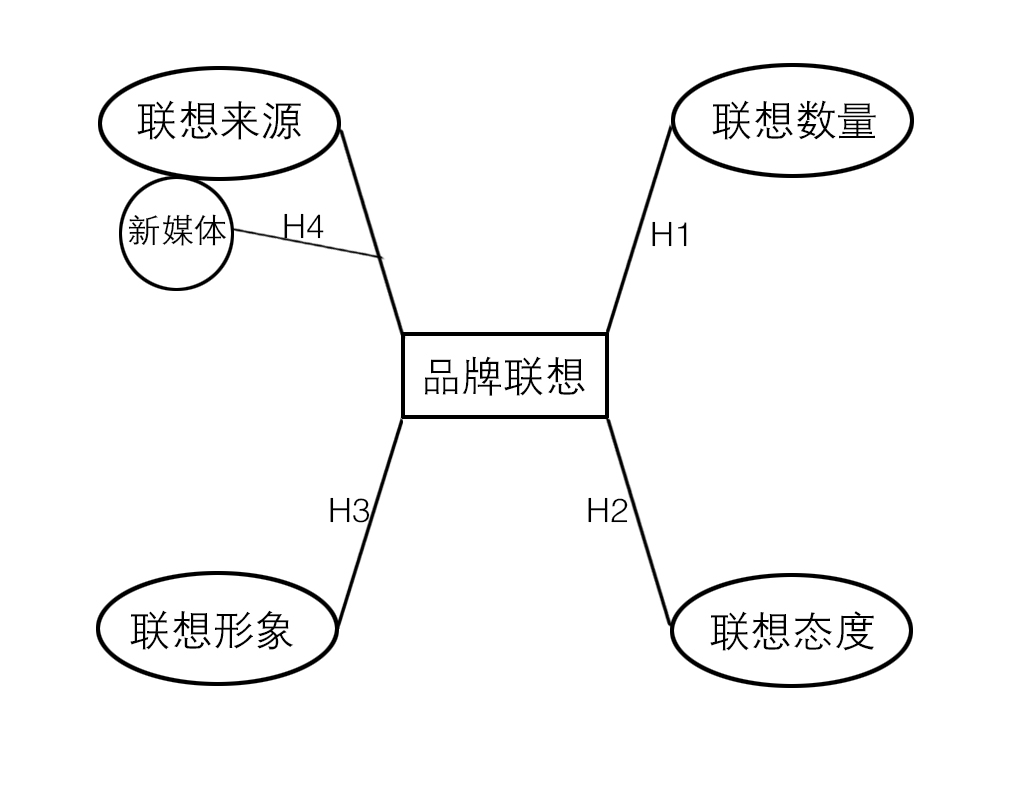 品牌联想的复杂性决定了考察品牌联想需要从多个维度进行。根据前文的文献综述,本文主要参考H.S. Krishnan记忆联想模型,在整合营销传播视角下提出品牌联想结构分析模型及假设(如图3.1所示),该模型包含四个维度,分别为: