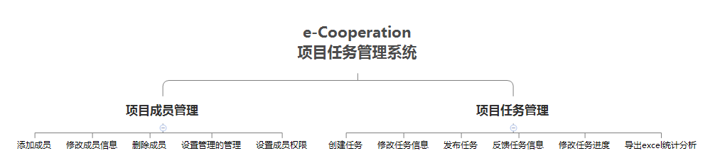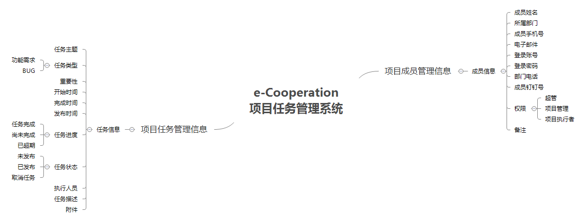 依据前期实际项目流程的调研结果和项目任务管理现状问题总结,以目标用户为维度进行系统的需求分析。本系统的切入点是任务从创建发布到完成这一套流程的系统化、透明化管理。针对管理人力资源的人,系统需要支持对流动人员的管理,如添加新成员,删除离职的成员信息,支持对成员的所属部门或管理人员进行管理,支持对成员辅助信息如手机号和邮箱等信息的管理,便于成员间相互联系;针对项目任务的管理者,支持项目任务和任务执行人一对一管理,任务进度和反馈可知,做到任务执行过程中密切监督,确保任务按质按量完成;针对项目执行者,系统要支持任务明细清晰,任务重要性可知,使得执行者可以对自己的任务有个明确的排期,任务执行过程中有疑问或者问题可以及时反馈。总结以上需求,功能模块为两个大的方向:任务管理和项目成员管理。