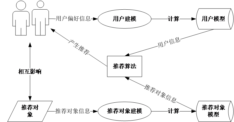 目前,几乎所有的电子商务网站、新闻网站、智能学习网站等都建立了自己的个性化推荐系统,使之能够为用户提供更加个性化的智能服务,这种行为也给企业带来了一定的经济效益。个性化推荐系统主要包括以下三个部分:用户建模模块、推荐对象建模模块以及推荐算法模块[6],其系统典型模型如图1.2所示。