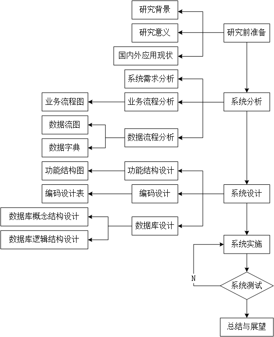 结合以上研究内容并参考系统开发流程,将本次的研究划分为研究前准备、系统分析、系统设计、系统实施、系统测试、总结与展望等六个阶段,并将技术路线绘制成图,如图1.1所示。