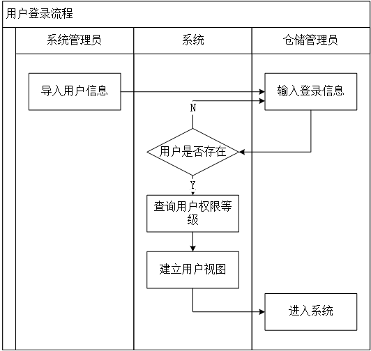 根据系统需求分析,仓储管理员在登录系统后的主要操作涉及入库业务、出库业务、库存管理业务、信息维护业务等,系统管理员在登录系统后的主要操作涉及用户信息维护等系统维护业务等。这里就用户登录、入库业务、出库业务流程做简单介绍。