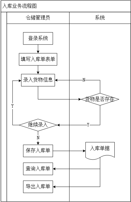 在入库业务中,仓储管理员根据实际入库的货物信息填写入库单,在入库单中包含时间、负责人、备注以及各种入库货物等需要填写的信息,在填写完成单据内容后便可保存这一入库单。同时仓储管理员还应能够查看历史入库单据,并能按照单据编号或者单据时间来筛选符合条件的某一或某些单据来完成历史单据的查看、审核等内容,另外历史单据应该能够导出为Excel以便能够在其他办公软件中更为方便的传阅、查看。入库业务流程图如图2.2所示