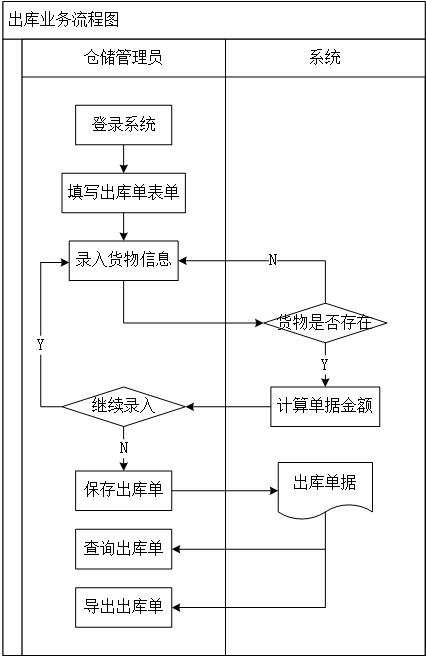 在该业务中,仓储管理员根据实际出库情况填写出库单,在出库单中同样包含包含时间、负责人、备注、货物信息等需要填写或者选择的内容。并能够对填写有问题的信息进行更改,比如修改某种货物的数量信息或者将某种货物信息删除。填写确认完成后可以将本出库单保存在系统之中。与入库管理类似,在出库业务中也应能够查看并导出历史出库单据信息以便完成后续的查看、审核等需要用到出库单据的其他操作。出库业务流程图如图2.3所示。