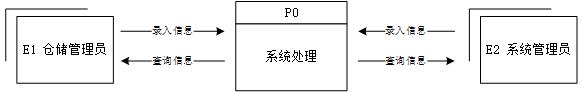 根据网络设备分销商仓储管理系统业务流程分析可知,系统的主要实体有仓储管理员和系统管理员,实体对信息进行录入,修改,删除,查询等处理过程。系统用户(包括仓储管理员与系统管理员)与系统之间的数据交互主要便是信息的录入与查询。据此,便可得到系统顶层数据流程图,如图2.5所示。