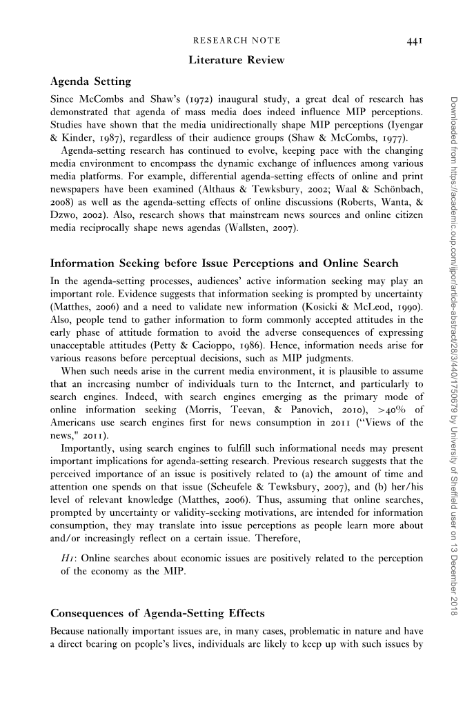自从McCombs和Shaw(1972)的首次研究以来,大量的研究表明大众传媒的议程确实影响着MIP的感知。研究表明,媒介单向塑造了MIP的感知(Iyengar&Kinder,1987),而不考虑他们的受众(Shaw&McCombs,1977)。