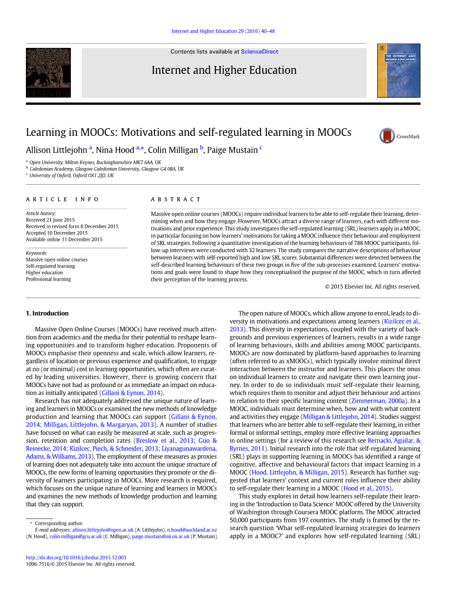 大型开放式网络学习的开放性,允许任何人入学,导致学习者之间的动机和期望的多样性。预期的多样性,加上学习者的背景和以往经验,导致了MOOC参与者之间广泛的学习行为,技能和能力.MOCO现在以基于平台的学习方式为主,通常涉及最小的直接交互讲师和学习者之间。这使我们在个人学习者身上创造和导航自己的学习之旅。为了做到这一点,个人必须自我调节自己的学习,这就要求他们监督和调整关于他们的具体学习环境的行为。在MOOC中,个人必须确定何时,如何以及所涉及的内容和活动。研究表明,学习者能够更好地自我调节自己的学习正式或非正式的设置,在线设置中采用更有效的学习方法。初步研究自我调节学习在支持MOOC中的学习中发挥的作用,已经确定了影响学习的一系列认知,情感和行为因素。研究进一步表明,学习者的语境和当前的角色影响了他们在MOOC中自我调节学习的能力。