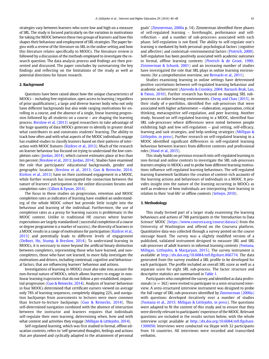本研究详细探讨了华盛顿大学通过Coursera MOOC平台提供的“数据科学导论”MOOC中学习者如何自我调节自己的学习。 MOOC从197个国家吸引了5万人参加。这项研究是由研究问题“学习者在MOOC中应用的自我调节学习策略”所构成的,并探讨了自我调节的学习策略如何在衡量SRL的学生中得分低低的学习者之间有所不同。这项研究特别侧重于采用这两个团体之间的MOOC的动机的变化,以及如何塑造其行为和对SRL策略的使用。本文首先回顾了在线设置中关于SRL的文献,以及这些文献如何相关具体到MOOCs。文献综述之后是讨论研究问题的方法。然后介绍和讨论数据分析过程和发现。本文总结了主要发现,并反映了研究的局限性以及未来研究的潜在方向。