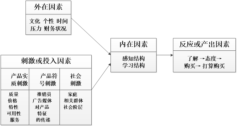 该模式认为,外在因素与刺激因素都能够影响消费者的内在感知因素,这两者是购买行为的刺激物,消费者在接收刺激后,内在心理会产生变化,引起消费动机,进而产生各种选择方案的信息,消费者通过了解这些信息,对产品产生理解,进而形成对这次购买行为的感知,因素之间相互作用则影响消费者的消费选择偏好,产生购买结果。