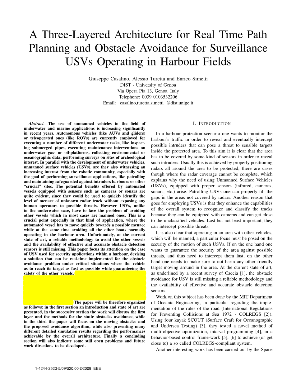近年来,无人驾驶工具在水下和海洋领域的应用正在显著增加。自动驾驶工具(如水下潜航器和滑翔机)或远程操作的(如水下机器人)目前用于执行许多不同的水下任务,例如检查水下管道,在水下天然气或石油平台上执行维护、干预工作,收集环境或海洋数据,对遗址进行调查。随着水下潜航器,水面无人艇(USV)的发展,也见证了来自机器人社区日益增长的兴趣,特别是为了执行监视目标的任务,例如在港口或其他“关键”站点进行巡逻、维护和防御入侵者。配备有摄像机或声纳等传感器的自动化船舶所带来的潜在好处非常明显,因为它们可用于快速识别未知雷达轨道的威胁程度,而不会使任何操作人员面临潜在的威胁。然而,与水下情况不同的是,USV必须面临避开其他船只的问题,因为在大多数情况下,其他船只都是有人驾驶的。这是非常重要的一点,特别是在这类应用中,自动化船只必须迅速向可能的威胁移动,同时避开在海港地区正常作业的所有其他船只。不幸的是,在目前的技术水平上,仍然缺乏一种可靠的方法来避开其他船只,也没有有效和准确的障碍探测传感器。本文研究的USV用于安全应用的情况下在一个港口制定一个解决方案,可以实现实时避障,在危险情况下可以在尽可能快地达到其目标的同时,保证其他船只的安全。提出的解决方案是基于三层的分层体系结构:第一层计算全局已知的先验路径,考虑静态障碍;第二层是利用运动障碍物的运动学数据以局部最优的方式修改这条路径(在某些假设条件下);而最后一层是被动地避免当这些数据不可用时的障碍。