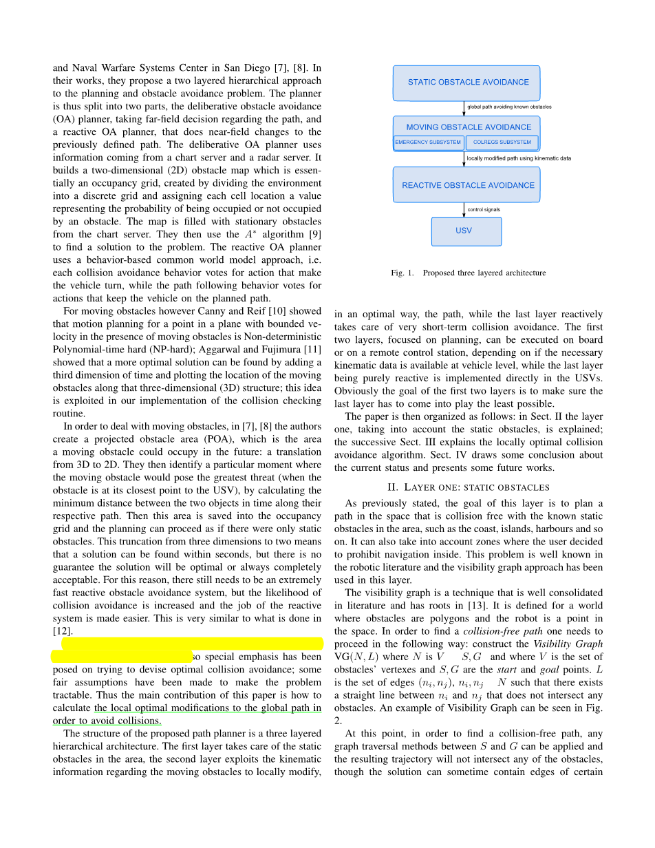 论文的内容如下:第二节,解释第一层,考虑到静态障碍;紧接着的第三节,介绍了局部最优避碰算法;第四节总结了得出的一些结论,并对今后的工作进行了展望。