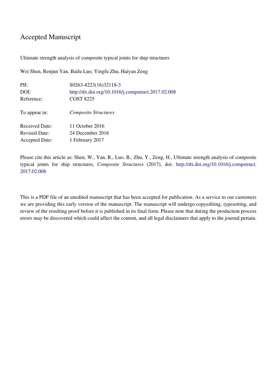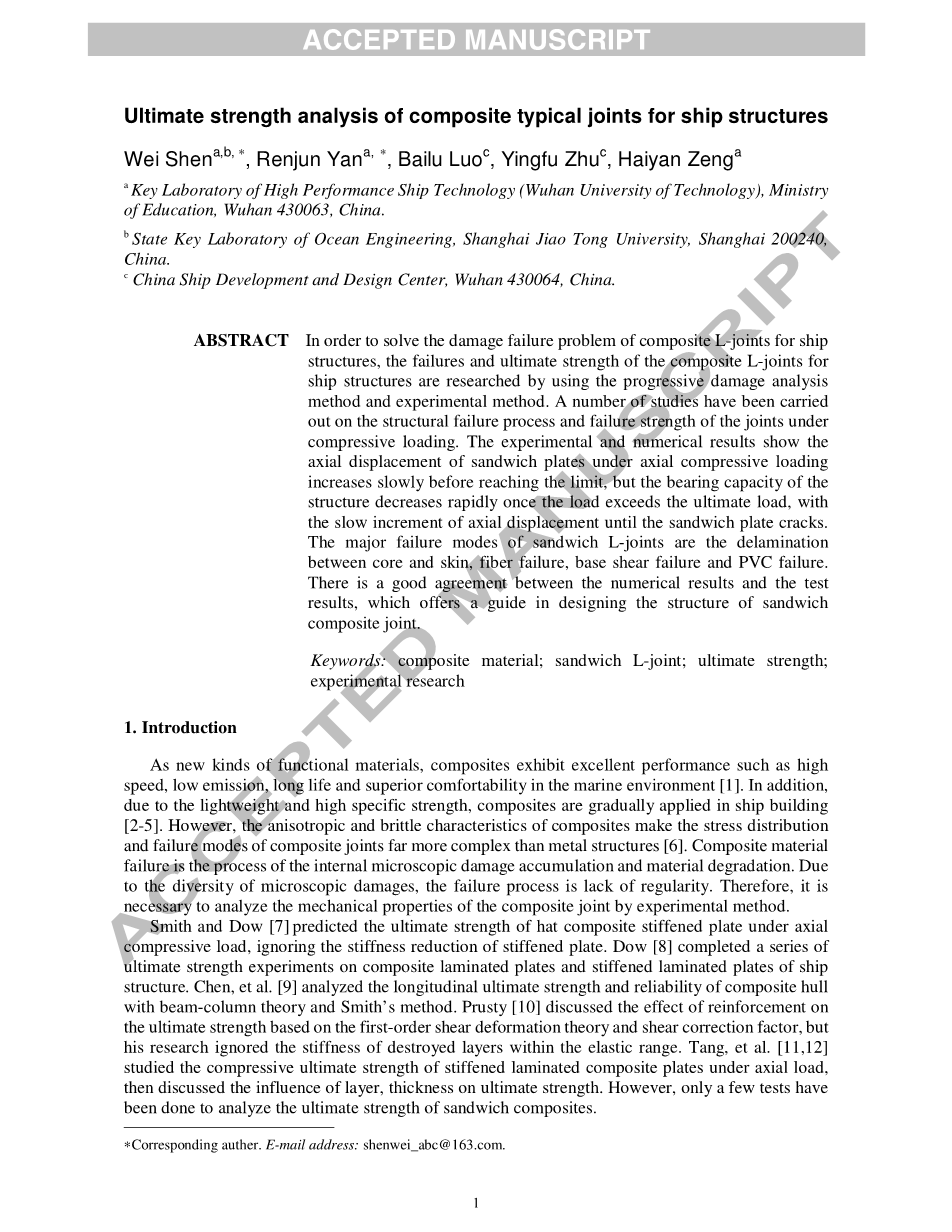 史密斯和道[7]在忽略加筋板的刚度折减的情况下,预测了复合加筋板在轴向压缩载荷作用下的极限承载力,道[8]完成了船用复合材料层合板和加筋层合板的一系列极限强度试验。陈,等人[9]用梁柱理论和史米斯法分析了复合材料船体的纵向极限强度和可靠性。基于一阶剪切变形理论和剪切修正系数,普拉斯提[10]讨论了钢筋对极限强度的影响,但他的研究忽略了弹性范围内破坏层的刚度。唐等人[11 12]研究了在轴向荷载作用下的加筋复合材料层合板压的压缩极限强度,之后还讨论了层数和厚度对极限强度的影响。然而,只有少数的实验了分析了夹芯复合材料的极限强度。