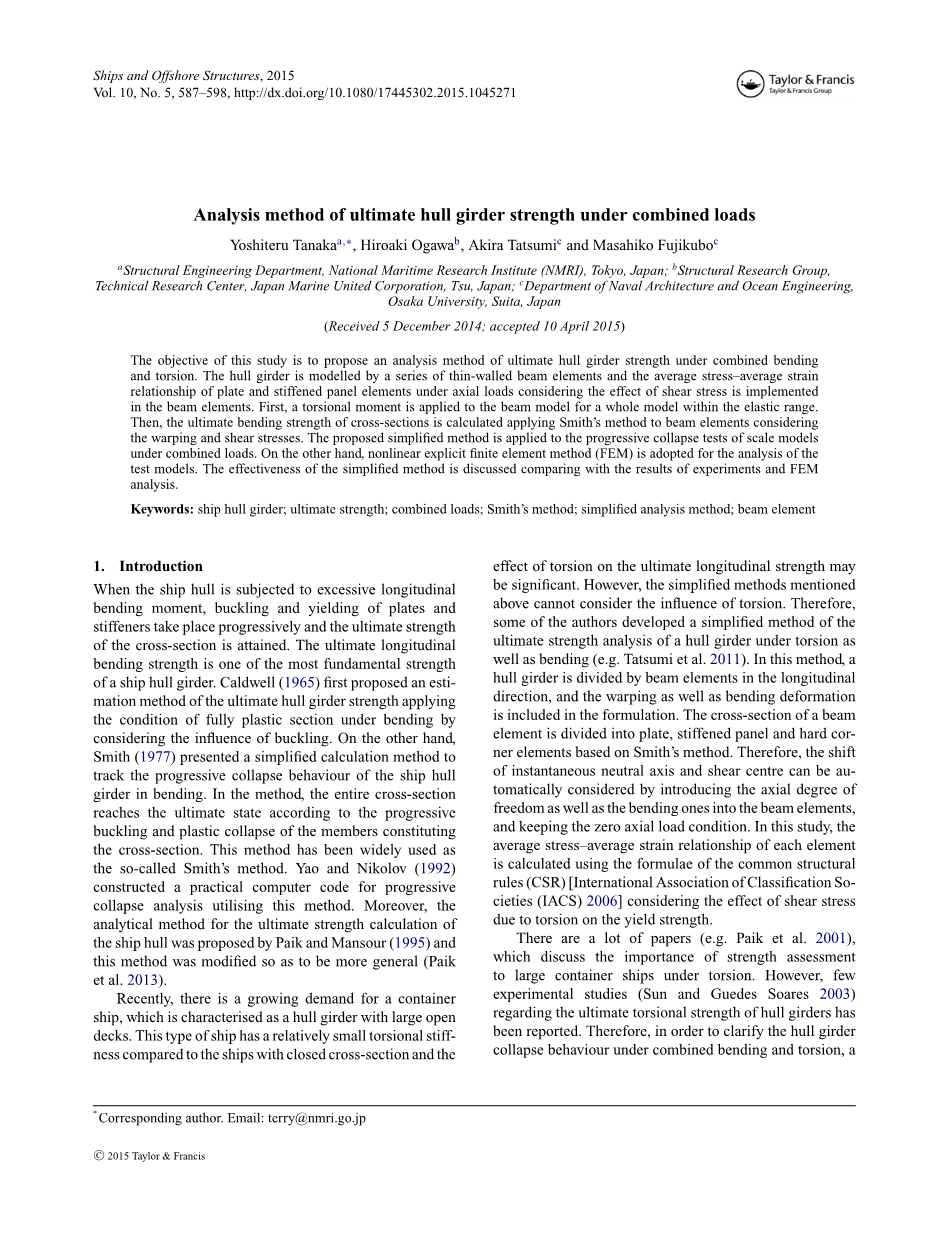 对于一般的集装箱船来说,由波浪引起的扭矩的最大值最大为垂直弯矩的10%(ClassNK2012)。因此,对于为实验所选择的组合载荷的条件,扭曲的影响被高估了,并且,这种负载条件是一个静态确定的问题,以保持施加的垂直弯曲和扭转力矩之间的比率在弹性范围内恒定不变。所以,对实际船只的分析,需要各种装载条件的组合,因为实验获得的结果仅对在所考虑的横截面处的特定载荷组合是有效的。然而,本文研究的主要目的是将史密斯法引入到普通的梁单元中,这涉及通过在组合载荷下的实验得到的溃缩行为。