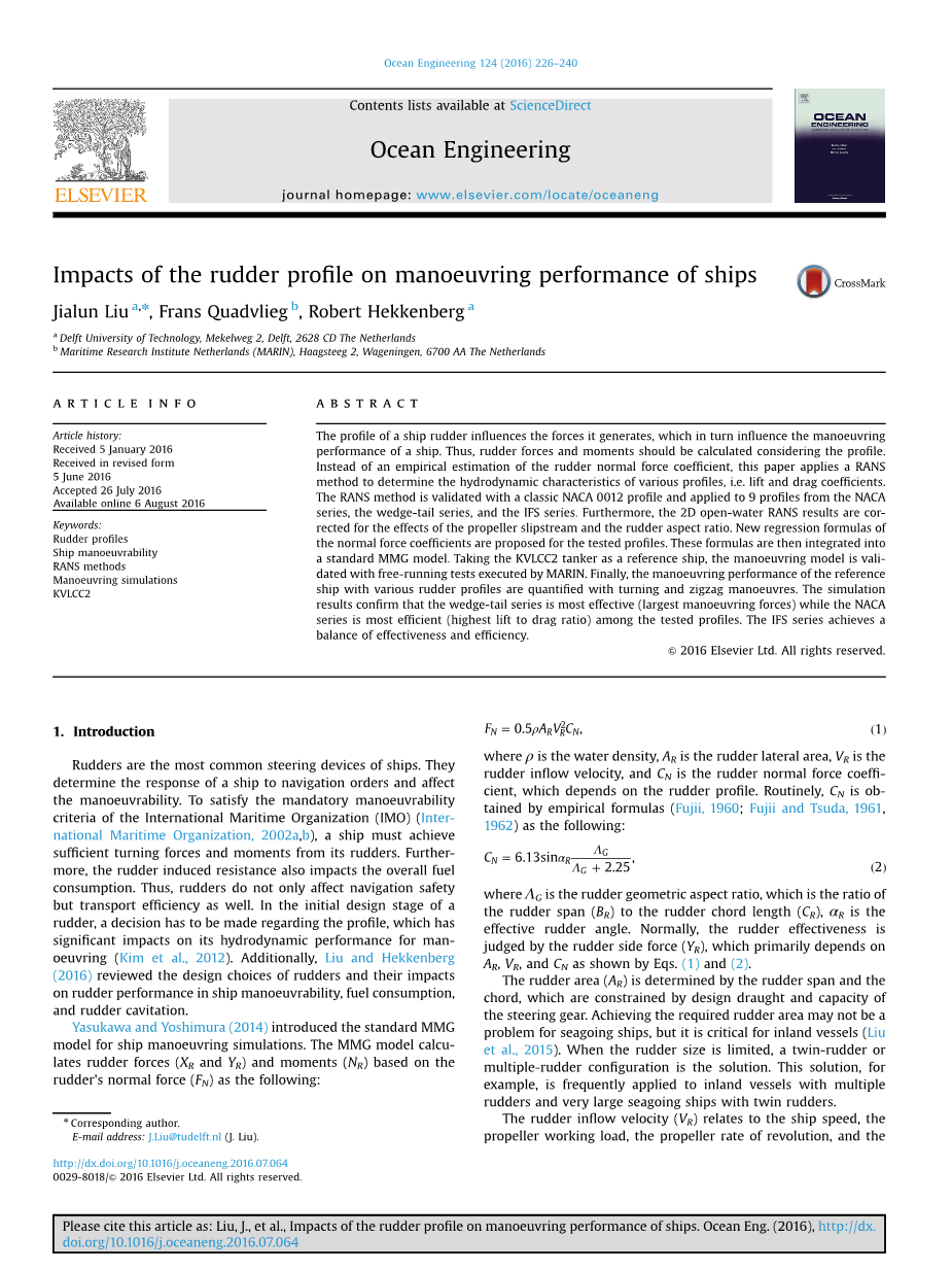 舵的剖面形状通常分为不同的系列,其最大厚度和位置不同。不同的舵系列具有不同的流体动力特性(Thieme,1965)。舵剖面形状的选择应取决于船舶资料和航行条件。Mulholland和Turnock(2007)提出了舵类型的概述。本文比较了3个舵系列,即NACA,楔尾和IFS的9个剖面形状的流体力学特性。
