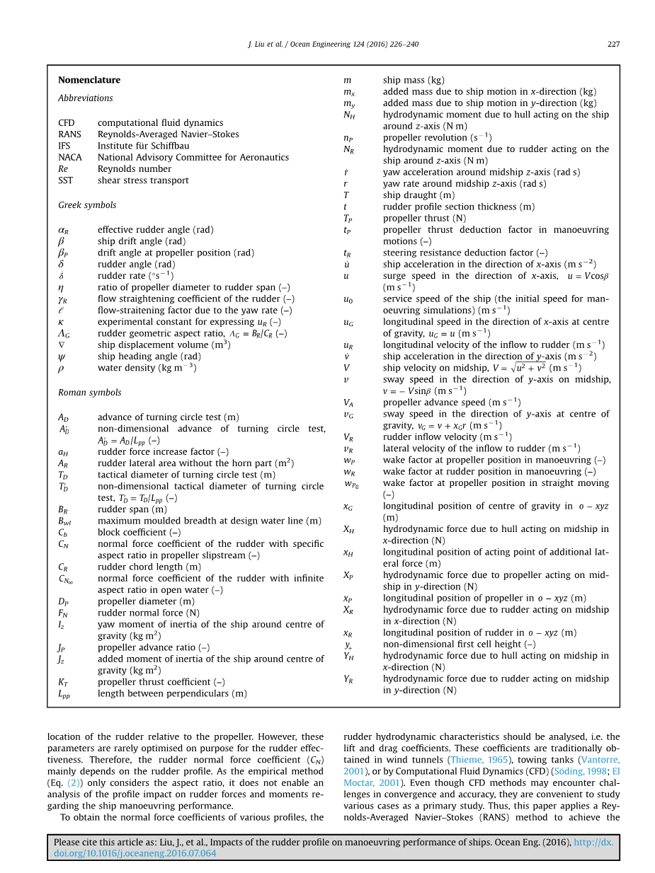 本文介绍了基于RANS计算的KVLCC2油轮的9种舵剖面形状(来自3个系列,即国家航空咨询委员会(NACA),Schiffbau(IFS)研究所和楔形尾)的操纵模拟的结果。第2章讨论了舵剖面形状的特性。第3章描述了使用RANS方法的在NACA 0012剖面形状的风洞得到验证的网格和求解器。第4章介绍了测试剖面形状的流体力学特性。然后对螺旋桨滑流和舵展弦比对结果的影响进行修正。第5章介绍了用于操纵模拟的通过了KVLCC2的油轮上NACA 0018剖面形状舵的自由运行测试的验证的数学模型。第6章介绍了KVLCC2油轮在各种舵剖面形状下进行回转和Z型运动时操纵性能。最后在第七章得出结论。