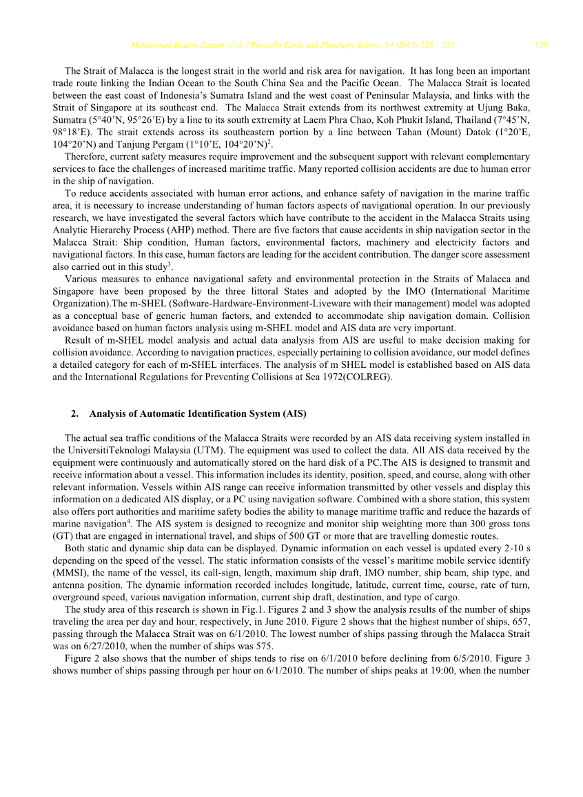马来西亚理工大学的AIS数据接收系统记录了马六甲海峡的实际海上交通状况,这些设备被用来收集数据,设备接收到的所有AIS数据自动连续存储在PC的硬盘上。使用AIS是为了发送和接收有关船舶的信息,这些信息包括它的特性、位置、速度和航向,以及其他相关信息。在AIS范围内的船舶可接收其他船舶发送的信息,并将这些信息显示在专用的AIS显示器或使用导航软件的PC上。与岸站联合,该系统还可协同港口当局和海事安全机构管理海上交通和减少海上航行危险。AIS旨在识别和监控重量超过300总吨的国际航行船舶,以及500总吨以上的国内航行船舶。
